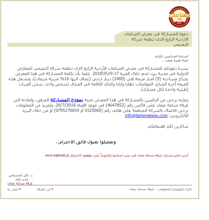 يسرنا دعوتكم للمشاركة في معرض وظيفي، تنظمه غرفة صناعة عمان في جامعة البلقاء التطبيقية تحت رعاية وزير العمل وذلك على هامش ورشة عمل "صنع في الأردن" يوم الأربعاء الموافق 12\7\2017 ، علماً أن رسوم المشاركة ستكون مجانية، كما يمكن للمشاركين عرض عينات من منتجاتهم في هذا المعرض.