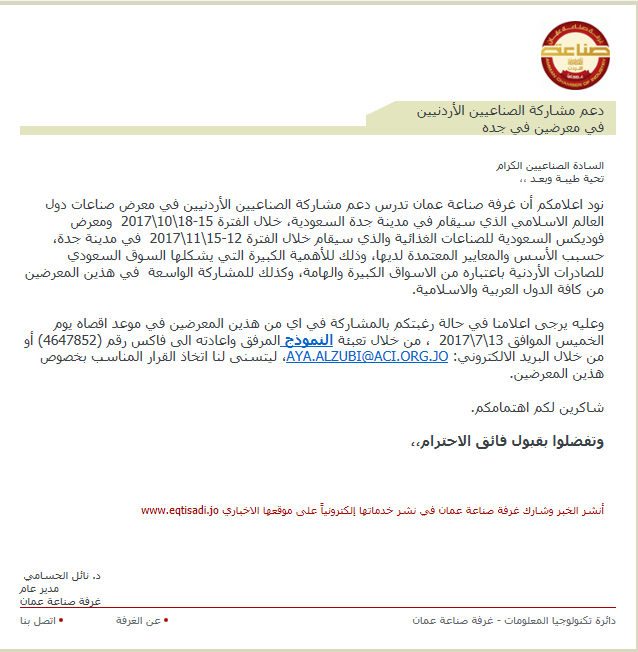 وعليه يرجى اعلامنا في حالة رغبتكم بالمشاركة في اي من هذين المعرضين في موعد اقصاه يوم الخميس الموافق 13\7\2017 ، من خلال تعبئة النموذج المرفق واعادته الى فاكس رقم (4647852) أو من خلال البريد الالكتروني: AYA.ALZUBI@ACI.ORG.JO، ليتسنى لنا اتخاذ القرار المناسب بخصوص هذين المعرضين.