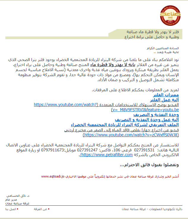 نود اعلامكم بناء على ما بلغنا من شركة البتراء للريادة المجتمعية الخضراء بوجود فلتر بترا الصحي الذي يتميز عن غيره من الفلاتر بانه لا يهدر ولا قطرة ماء المنتج صناعة وطنية وحاصل على براء اختراع، يعمل الفلتر بطريقة مبتكرة ويزودك بنوعين مياه عذبة واخرى معدنية (نسبة الاملاح مناسبة لجسم الإنسان ويمكن التحكم بها)، ومصنع من مواد ذات جودة عالية جدا. و تقوم الشركة بتوفير منظومة متكاملة تشمل التوصيل و التركيب و ضمان الأداء.