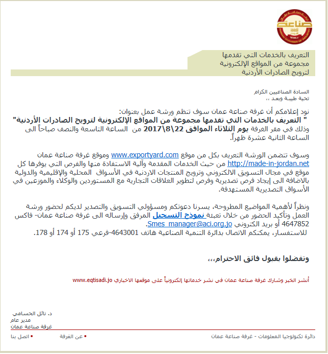 ونظراً لأهمية المواضيع المطروحة، يسرنا دعوتكم ومسؤولي التسويق والتصدير لديكم لحضور ورشة العمل وتأكيد الحضور من خلال تعبئة نموذج التسجيل المرفق وإرساله الى غرفة صناعة عمان- فاكس 4647852 أو بريد الكتروني Smes_manager@aci.org.jo.