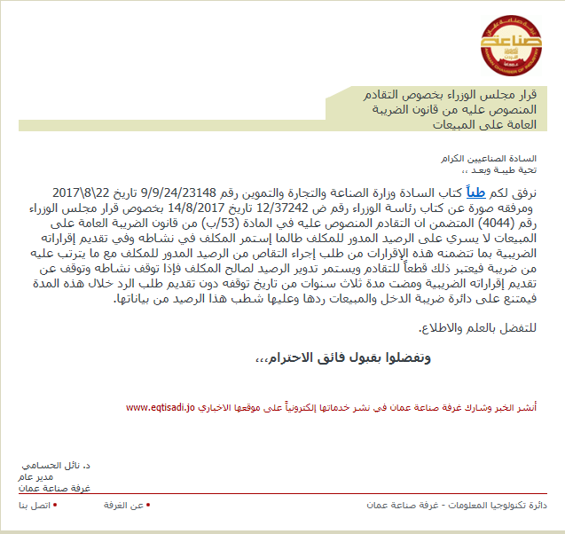 نرفق لكم طياً كتاب السادة وزارة الصناعة والتجارة والتموين رقم 9/9/24/23148 تاريخ 22\8\2017 ومرفقه صورة عن كتاب رئاسة الوزراء رقم ض 12/37242 تاريخ 14/8/2017 بخصوص قرار مجلس الوزراء رقم (4044) المتضمن ان التقادم المنصوص عليه في المادة (53/ب) من قانون الضريبة العامة على المبيعات لا يسري على الرصيد المدور للمكلف طالما إستمر المكلف في نشاطه وفي تقديم إقراراته الضريبية بما تتضمنه هذه الإقرارات من طلب إجراء التقاص من الرصيد المدور للمكلف مع ما يترتب عليه من ضريبة فيعتبر ذلك قطعاً للتقادم ويستمر تدوير الرصيد لصالح المكلف فإذا توقف نشاطه وتوقف عن تقديم إقراراته الضريبية ومضت مدة ثلاث سنوات من تاريخ توقفه دون تقديم طلب الرد خلال هذه المدة فيمتنع على دائرة ضريبة الدخل والمبيعات ردها وعليها شطب هذا الرصيد من بياناتها.