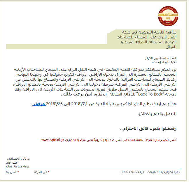 نود اعلام سعادتكم بموافقة اللجنة المختصة في هيئة النقل البري على السماح للشاحنات الأردنية المحملة بالبضائع المصدرة الى العراق بدخول الاراضي العراقية لتفريغ حمولتها في وجهتها النهائية، وكذلك السماح للشاحنات العراقية بالدخول محملة الى الاراضي الاردنية والسماح لها بالتحميل من الاراضي الأردنية الى الاراضي العراقية شريطة دخولها الى الاراضي الاردنية محملة بالبضائع العراقية، فيما سيتم السماح باستمرار العمل بطريق تفريغ الحمولات من الشاحنات الأردنية الى العراقية وفقا لطريقة “Back To Back” للبضائع السائلة والخطرة، لمن يرغب بذلك .