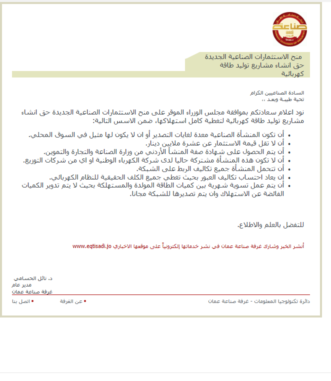 نود اعلام سعادتكم بموافقة مجلس الوزراء الموقر على منح الاستثمارات الصناعية الجديدة حق انشاء مشاريع توليد طاقة كهربائية لتغطية كامل استهلاكها، ضمن الاسس التالية: