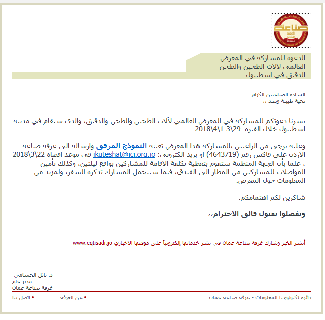 وعليه يرجى من الراغبين بالمشاركة هذا المعرض تعبئة النموذج المرفق وارساله الى غرفة صناعة الاردن على فاكس رقم (4643719) او بريد الكتروني: ikuteshat@jci.org.jo في موعد اقصاه 22\3\2018 ، علما بأن الجهة المنظمة ستقوم بتغطية تكلفة الاقامة للمشاركين بواقع ليلتين، وكذلك تأمين المواصلات للمشاركين من المطار الى الفندق، فيما سيتحمل المشارك تذكرة السفر، ولمزيد من المعلومات حول المعرض.