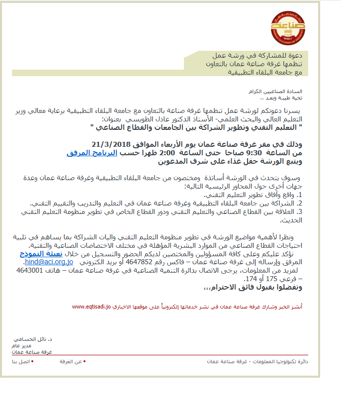 يسرنا دعوتكم لورشة عمل تنظمها غرفة صناعة بالتعاون مع جامعة البلقاء التطبيقية برعاية معالي وزير التعليم العالي والبحث العلمي- الأستاذ الدكتور عادل الطويسي  بعنوان: