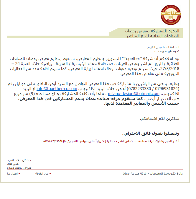 وعليه، يرجى من الراغبين بالمشاركة في هذا المعرض التواصل مع السيد أيمن الناطور على موبايل رقم (0796931824 / 0782233330) أو من خلال البريد الالكتروني info@together-co.com او البريد الالكتروني: milano-design@hotmail.com ، علما بأن تكلفة المشاركة بجناح مساحته (9) متر مربع هي ألف دينار أردني، كما ستقوم غرفة صناعة عمان بدعم المشاركين في هذا المعرض، حسب الأسس والمعايير المعتمدة لديها.