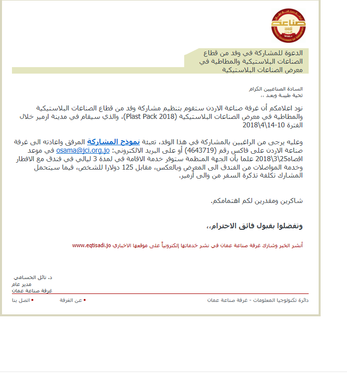 نود اعلامكم أن غرفة صناعة الاردن ستقوم بتنظيم مشاركة وفد من قطاع الصناعات البلاستيكية والمطاطية في معرض الصناعات البلاستيكية (Plast Pack 2018)، والذي سيقام في مدينة ازمير خلال الفترة 10-14\4\2018