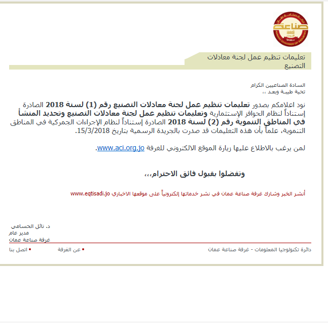 نود اعلامكم بصدور تعليمات تنظيم عمل لجنة معادلات التصنيع رقم (1) لسنة 2018 الصادرة إستناداً لنظام الحوافز الإستثمارية وتعليمات تنظيم عمل لجنة معادلات التصنيع وتحديد المنشأ في المناطق التنموية رقم (2) لسنة 2018 الصادرة إستناداً لنظام الإجراءات الجمركية في المناطق التنموية، علماً بأن هذه التعليمات قد صدرت بالجريدة الرسمية بتاريخ 15/3/2018.