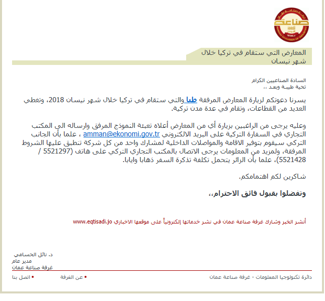 وعليه يرجى من الراغبين بزيارة أي من المعارض أعلاه تعبئة النموذج المرفق وارساله الى المكتب التجاري في السفارة التركية على البريد الالكتروني amman@ekonomi.gov.tr ، علما بأن الجانب التركي سيقوم بتوفير الاقامة والمواصلات الداخلية لمشارك واحد من كل شركة تنطبق عليها الشروط المرفقة، ولمزيد من المعلومات يرجى الاتصال بالمكتب التجاري التركي على هاتف (5521297 / 5521428)، علما بأن الزائر يتحمل تكلفة تذكرة السفر ذهابا وايابا.