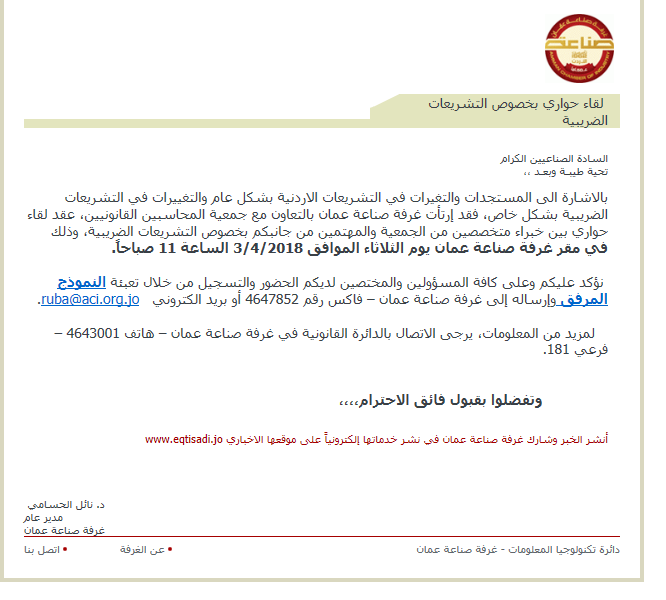 بالاشارة الى المستجدات والتغيرات في التشريعات الاردنية بشكل عام والتغييرات في التشريعات الضريبية بشكل خاص، فقد إرتأت غرفة صناعة عمان بالتعاون مع جمعية المحاسبين القانونيين، عقد لقاء حواري بين خبراء متخصصين من الجمعية والمهتمين من جانبكم بخصوص التشريعات الضريبية، وذلك في مقر غرفة صناعة عمان يوم الثلاثاء الموافق 3/4/2018 الساعة 11 صباحاً.