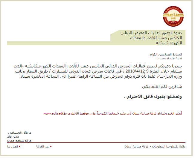 يسرنا دعوتكم لحضور فعاليات المعرض الدولي الخامس عشر للآلات والمعدات الكهروميكانيكية والذي سيقام خلال الفترة 9-12\4\2018 ، في قاعات معرض عمان الدولي للسيارات / طريق المطار بجانب وزارة الخارجية، علما بأن فترة دوام المعرض من الساعة الرابعة عصرا الى الساعة العاشرة مساء.