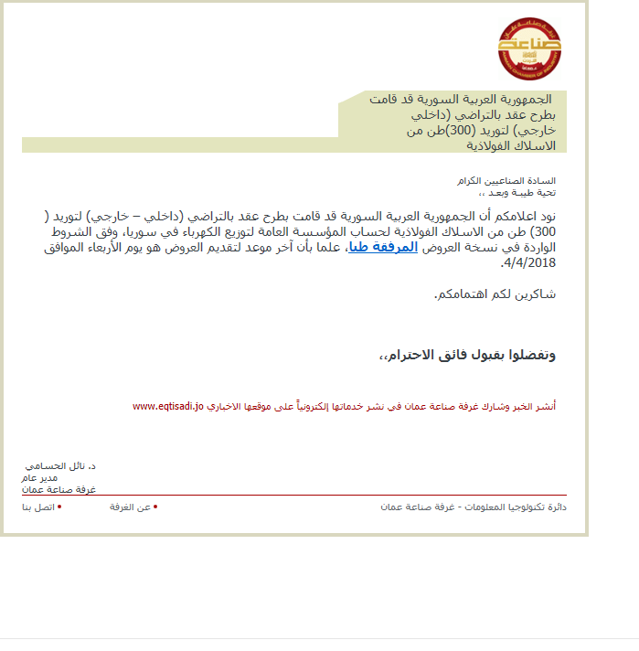 نود اعلامكم أن الجمهورية العربية السورية قد قامت بطرح عقد بالتراضي (داخلي – خارجي) لتوريد (300) طن من الاسلاك الفولاذية لحساب المؤسسة العامة لتوزيع الكهرباء في سوريا، وفق الشروط الواردة في نسخة العروض المرفقة طيا، علما بأن آخر موعد لتقديم العروض هو يوم الأربعاء الموافق 4/4/2018.