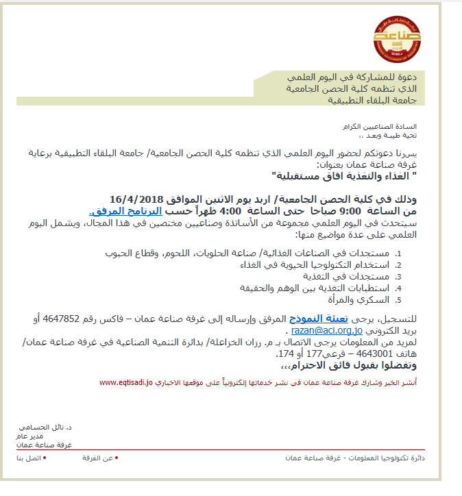 يسرنا دعوتكم لحضور اليوم العلمي الذي تنظمه كلية الحصن الجامعية/ جامعة البلقاء التطبيقية برعاية غرفة صناعة عمان بعنوان: