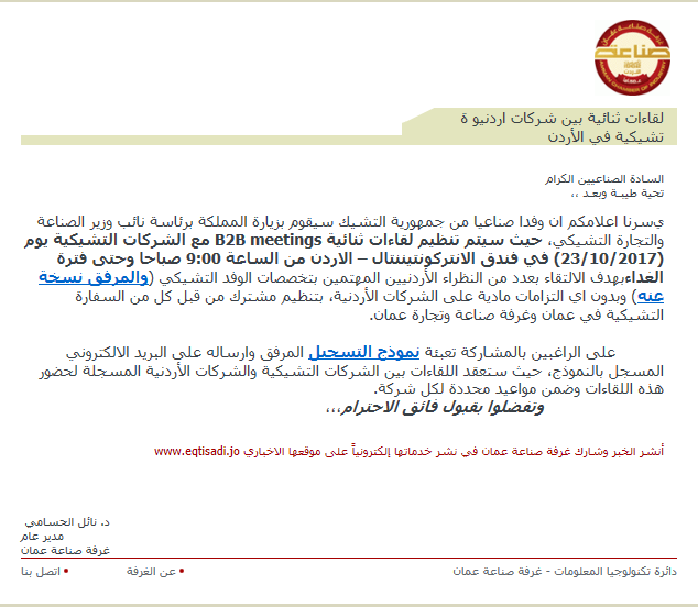 يسرنا اعلامكم ان وفدا صناعيا من جمهورية التشيك سيقوم بزيارة المملكة برئاسة نائب وزير الصناعة والتجارة التشيكي، حيث سيتم تنظيم لقاءات ثنائية B2B meetings مع الشركات التشيكية يوم (23/10/2017) في فندق الانتركونتيننتال – الاردن من الساعة 9:00 صباحا وحتى فترة الغداءبهدف الالتقاء بعدد من النظراء الأردنيين المهتمين بتخصصات الوفد التشيكي (والمرفق نسخة عنه) وبدون اي التزامات مادية على الشركات الأردنية، بتنظيم مشترك من قبل كل من السفارة التشيكية في عمان وغرفة صناعة وتجارة عمان.