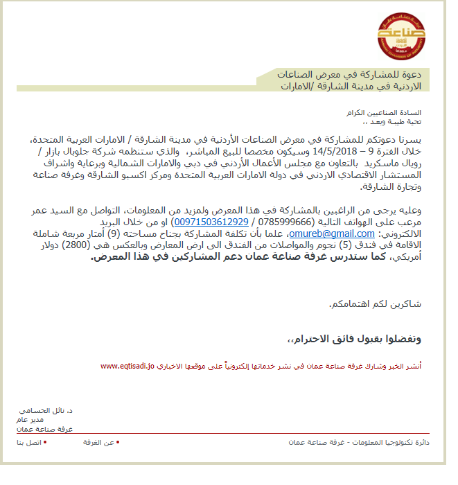 يسرنا دعوتكم للمشاركة في معرض الصناعات الأردنية في مدينة الشارقة / الامارات العربية المتحدة، خلال الفترة 9 – 14/5/2018 وسيكون مخصصا للبيع المباشر، والذي ستنظمه شركة جلوبال بازار / رويال ماسكريد بالتعاون مع مجلس الأعمال الأردني في دبي والامارات الشمالية وبرعاية واشراف المستشار الاقتصادي الاردني في دولة الامارات العربية المتحدة ومركز اكسبو الشارقة وغرفة صناعة وتجارة الشارقة.