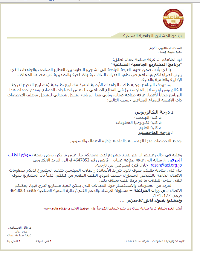 لمزيد من المعلومات والاستفسار حول المجالات التي يمكن تنفيذ مشاريع تخرج فيها، يمكنكم الاتصال بـ م. رزان الخزاعلة – مسؤولة الارشاد والدعم الفني/ دائرة التنمية الصناعية هاتف 4643001 فرعي 177، 174.