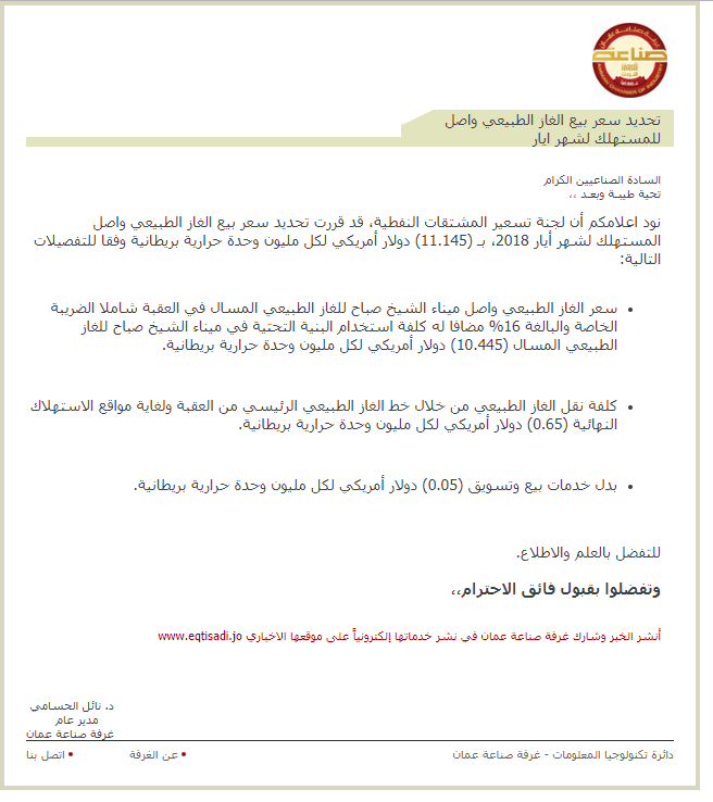 نود اعلامكم أن لجنة تسعير المشتقات النفطية، قد قررت تحديد سعر بيع الغاز الطبيعي واصل المستهلك لشهر أيار 2018، بـ (11.145) دولار أمريكي لكل مليون وحدة حرارية بريطانية وفقا للتفصيلات التالية: