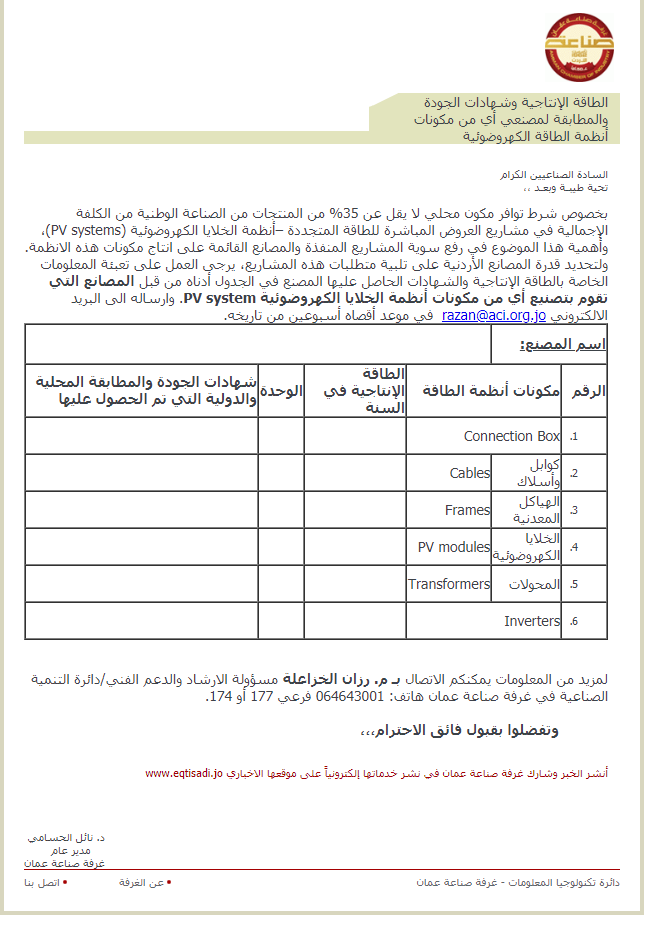 بخصوص شرط توافر مكون محلي لا يقل عن 35% من المنتجات من الصناعة الوطنية من الكلفة الإجمالية في مشاريع العروض المباشرة للطاقة المتجددة –أنظمة الخلايا الكهروضوئية (PV systems)، وأهمية هذا الموضوع في رفع سوية المشاريع المنفذة والمصانع القائمة على انتاج مكونات هذه الانظمة. ولتحديد قدرة المصانع الأردنية على تلبية متطلبات هذه المشاريع، يرجى العمل على تعبئة المعلومات الخاصة بالطاقة الإنتاجية والشهادات الحاصل عليها المصنع في الجدول أدناه من قبل المصانع التي تقوم بتصنيع أي من مكونات أنظمة الخلايا الكهروضوئية PV system. وارساله الى البريد الالكتروني razan@aci.org.jo في موعد أقصاه أسبوعين من تاريخه.