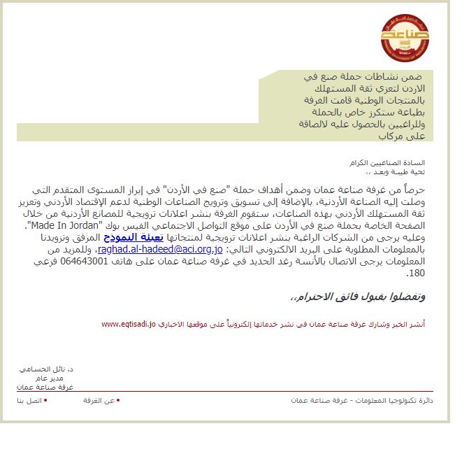 وعليه يرجى من الشركات الراغبة بنشر اعلانات ترويجية لمنتجاتها تعبئة النموذج المرفق وتزويدنا بالمعلومات المطلوبة على البريد الالكتروني التالي: raghad.al-hadeed@aci.org.jo، وللمزيد من المعلومات يرجى الاتصال بالأنسة رغد الحديد في غرفة صناعة عمان على هاتف 064643001 فرعي 180.
