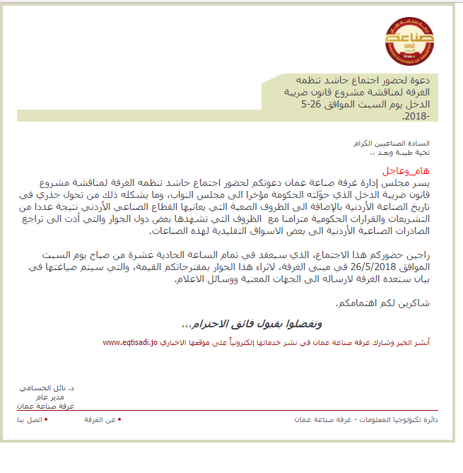 يسر مجلس إدارة غرفة صناعة عمان دعوتكم لحضور اجتماع حاشد تنظمه الغرفة لمناقشة مشروع قانون ضريبة الدخل الذي حوّلته الحكومة مؤخرا الى مجلس النواب، وما يشكله ذلك من تحول جذري في تاريخ الصناعة الأردنية بالإضافة الى الظروف الصعبة التي يعانيها القطاع الصناعي الأردني نتيجة عددا من التشريعات والقرارات الحكومية متزامنا مع الظروف التي تشهدها بعض دول الجوار والتي أدت الى تراجع الصادرات الصناعية الأردنية الى بعض الاسواق التقليدية لهذه الصناعات.