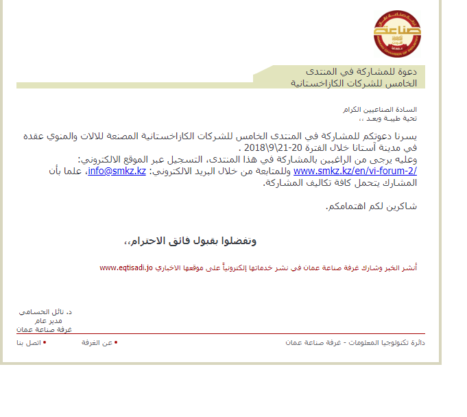 وعليه يرجى من الراغبين بالمشاركة في هذا المنتدى، التسجيل عبر الموقع الالكتروني: www.smkz.kz/en/vi-forum-2/ وللمتابعة من خلال البريد الالكتروني: info@smkz.kz، علما بأن المشارك يتحمل كافة تكاليف المشاركة.