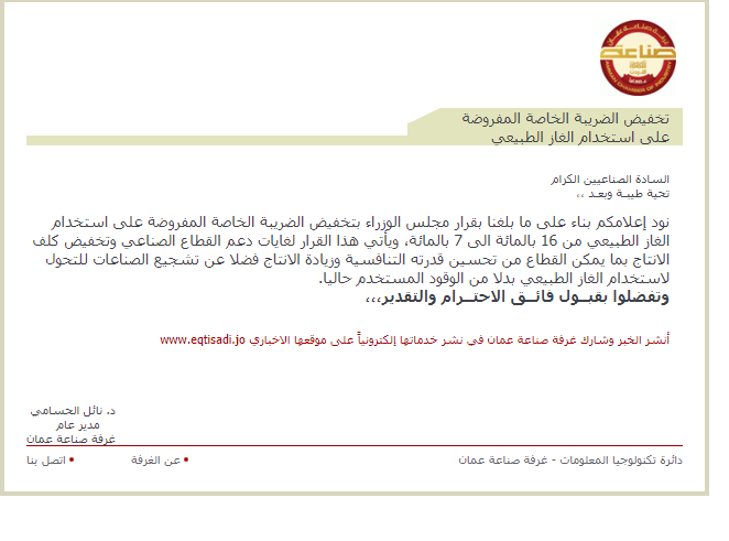 نود إعلامكم بناء على ما بلغنا بقرار مجلس الوزراء بتخفيض الضريبة الخاصة المفروضة على استخدام الغاز الطبيعي من 16 بالمائة الى 7 بالمائة، ويأتي هذا القرار لغايات دعم القطاع الصناعي وتخفيض كلف الانتاج بما يمكن القطاع من تحسين قدرته التنافسية وزيادة الانتاج فضلا عن تشجيع الصناعات للتحول لاستخدام الغاز الطبيعي بدلا من الوقود المستخدم حاليا.