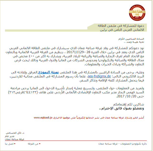نود دعوتكم للمشاركة في وفد غرفة صناعة عمان الذي سيشارك في ملتقى الطاقة الالماني العربي الثامن الذي يعقد في برلين خلال الفترة 28 –29\11\2017 ، بتنظيم من الغرفة العربية الالمانية وبالتعاون مع الاتحاد العام لغرف التجارة والصناعة والزراعة للبلاد العربية، ويشارك به اكثر من ٤٠٠ مختص في مجال الطاقة والصناعة والتكنولوجيا ومندوبي الشركات من المانيا والدول العربية وذالك لبحث فرص التعاون والشراكة وتبادل الخبرات والمعلومات.