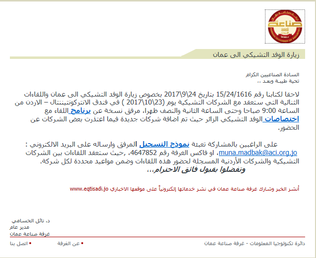لاحقا لكتابنا رقم 15/24/1616 بتاريخ 24\9\2017 بخصوص زيارة الوفد التشيكي الى عمان واللقاءات الثنائية التي ستعقد مع الشركات التشيكية يوم (23\10\2017 ) في فندق الانتركونتيننتال – الاردن من الساعة 9:00 صباحا وحتى الساعة الثانية والنصف ظهرا، مرفق نسخة عن برنامج اللقاء مع اختصاصات الوفد التشيكي الزائر حيث تم اضافة شركات جديدة فيما اعتذرت بعض الشركات عن الحضور.