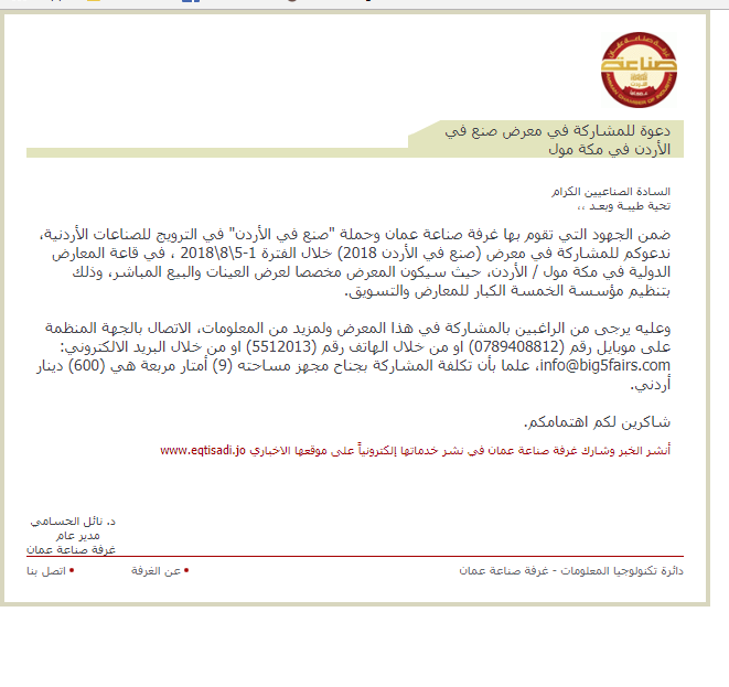 ضمن الجهود التي تقوم بها غرفة صناعة عمان وحملة "صنع في الأردن" في الترويج للصناعات الأردنية، ندعوكم للمشاركة في معرض (صنع في الأردن 2018) خلال الفترة 1-5\8\2018 ، في قاعة المعارض الدولية في مكة مول / الأردن، حيث سيكون المعرض مخصصا لعرض العينات والبيع المباشر، وذلك بتنظيم مؤسسة الخمسة الكبار للمعارض والتسويق.
