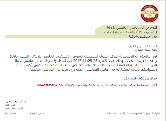 نود اعلامكم أن الجمهورية التركية سوف تستضيف المعرض الاسلامي الخامس للحلال (اكسبو حلال) والقمة العربية للحلال، وذلك خلال الفترة 23-25\11\2017 في اسطنبول، وذلك على هامش اعمال الدورة الـ 33 للجنة الدائمة للتعاون الاقتصادي والتجاري في منظمة التعاون الاسلامي (كومسيك).