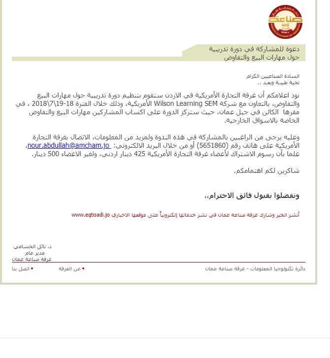 نود اعلامكم أن غرفة التجارة الأمريكية في الاردن ستقوم بتنظيم دورة تدريبية حول مهارات البيع والتفاوض، بالتعاون مع شركة Wilson Learning SEM الأمريكية، وذلك خلال الفترة 18-19\7\2018 ، في مقرها الكائن في جبل عمان، حيث ستركز الدورة على اكساب المشاركين مهارات البيع والتفاوض الخاصة بالاسواق الخارجية.