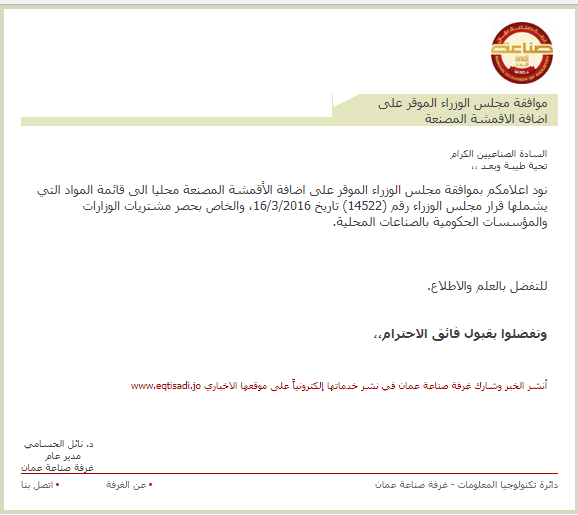 نود اعلامكم بموافقة مجلس الوزراء الموقر على اضافة الأقمشة المصنعة محليا الى قائمة المواد التي يشملها قرار مجلس الوزراء رقم (14522) تاريخ 16/3/2016، والخاص بحصر مشتريات الوزارات والمؤسسات الحكومية بالصناعات المحلية.