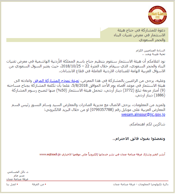 ولمزيد من المعلومات، يرجى الاتصال مع مديرية الصادرات والمعارض السيد وسام النسور رئيس قسم المعارض العربية على موبايل رقم (0799357788) او من خلال البريد الالكتروني: wesam.alnsour@jic.gov.jo
