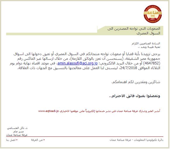 يرجى تزويدنا بأية قضايا أو صعوبات تواجه منتجاتكم في السوق المصري أو تعيق دخولها الى اسواق جمهورية مصر الشقيقة، (يستحسن أن تعزز بالوثائق اللازمة)، من خلال ارسالها عبر الفاكس رقم (4647852) أو من خلال البريد الالكتروني: amin.alasoufi@aci.org.jo، في موعد اقصاه نهاية دوام يوم الثلاثاء الموافق 24/7/2018، ليتسنى لنا العمل على معالجتها بالتنسيق مع الجهات ذات العلاقة.