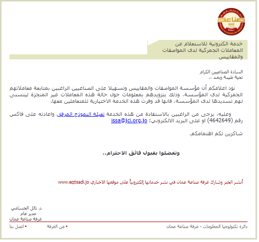 والمقاييس وتسهيلا على الصناعيين الراغبين بمتابعة معاملاتهم الجمركية لدى