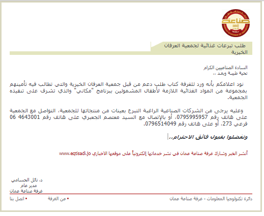 طلب دعم من قبل جمعية العرفان الخيرية والتي تطالب فيه تأمينهم بمجموعة من