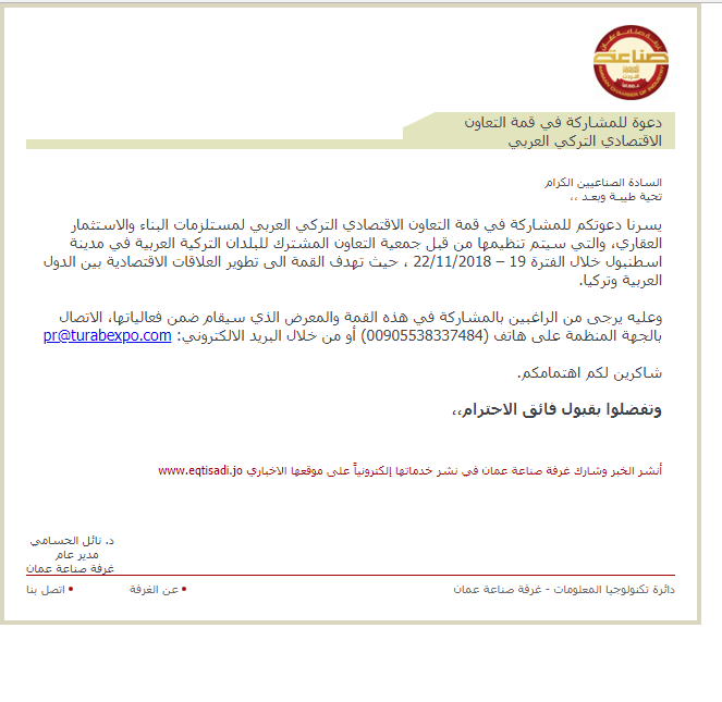 وعليه يرجى من الراغبين بالمشاركة في هذه القمة والمعرض الذي سيقام ضمن فعالياتها، الاتصال بالجهة المنظمة على هاتف (00905538337484) أو من خلال البريد الالكتروني: pr@turabexpo.com
