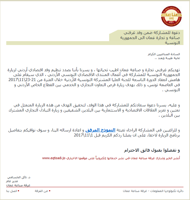 تهديكم غرفتي تجارة و صناعة عمان اطيب تحياتها ، و يسرنا بأننا بصدد تنظيم وفد اقتصادي أردني لزيارة الجمهورية التونسية للمشاركة في أعمال المنتدى الاقتصادي التونسي الأردني ، الذي سيقام على هامش انعقاد الدورة التاسعة للجنة العليا المشتركة التونسية الأردنية خلال الفترة من 21-23\11\2017 في العاصمة تونس، و ذلك بهدف زيارة فرص التعاون التجاري و الخدمي بين القطاع الخاص الأردني و التونسي.