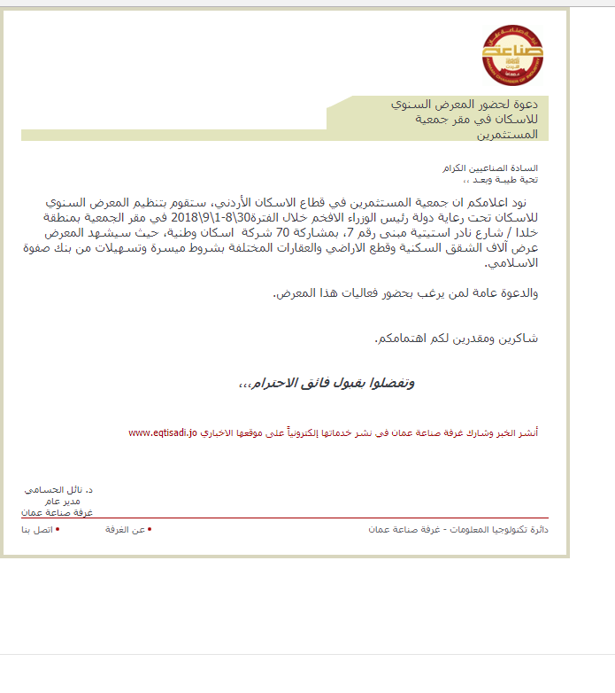 نود اعلامكم ان جمعية المستثمرين في قطاع الاسكان الأردني، ستقوم بتنظيم المعرض السنوي للاسكان تحت رعاية دولة رئيس الوزراء الافخم خلال الفترة30\8-1\9\2018 في مقر الجمعية بمنطقة خلدا / شارع نادر استيتية مبنى رقم 7، بمشاركة 70 شركة  اسكان وطنية، حيث سيشهد المعرض عرض آلاف الشقق السكنية وقطع الاراضي والعقارات المختلفة بشروط ميسرة وتسهيلات من بنك صفوة الاسلامي.