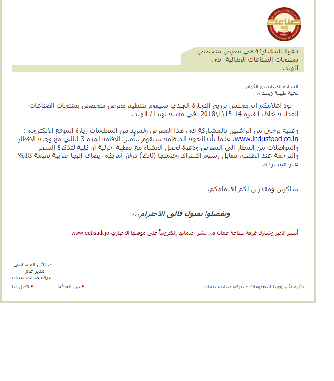 الموقع الالكتروني: www.indusfood.co.in، علما بأن الجهة المنظمة ستقوم بتأمين