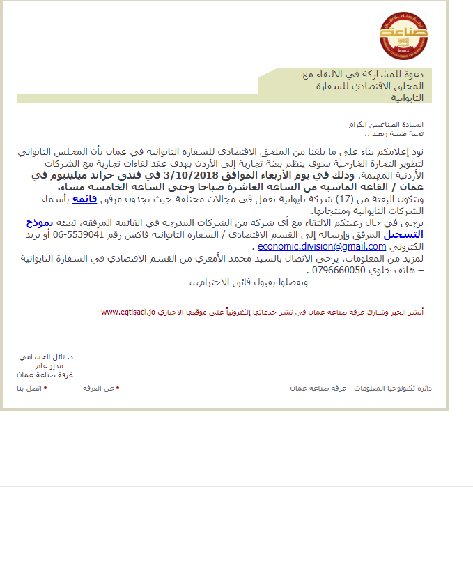 ود إعلامكم بناء على ما بلغنا من الملحق الاقتصادي للسفارة التايوانية في عمان بأن المجلس التايواني لتطوير التجارة الخارجية سوف ينظم بعثة تجارية إلى الأردن بهدف عقد لقاءات تجارية مع الشركات الأردنية المهتمة، وذلك في يوم الأربعاء الموافق 3/10/2018 في فندق جراند ميلينيوم في عمان / القاعة الماسية من الساعة العاشرة صباحا وحتى الساعة الخامسة مساء.