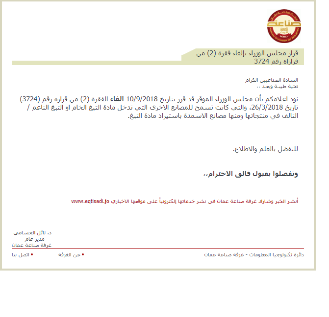 أود اعلامكم بأن مجلس الوزراء الموقر قد قرر بتاريخ 10/9/2018 الغاء