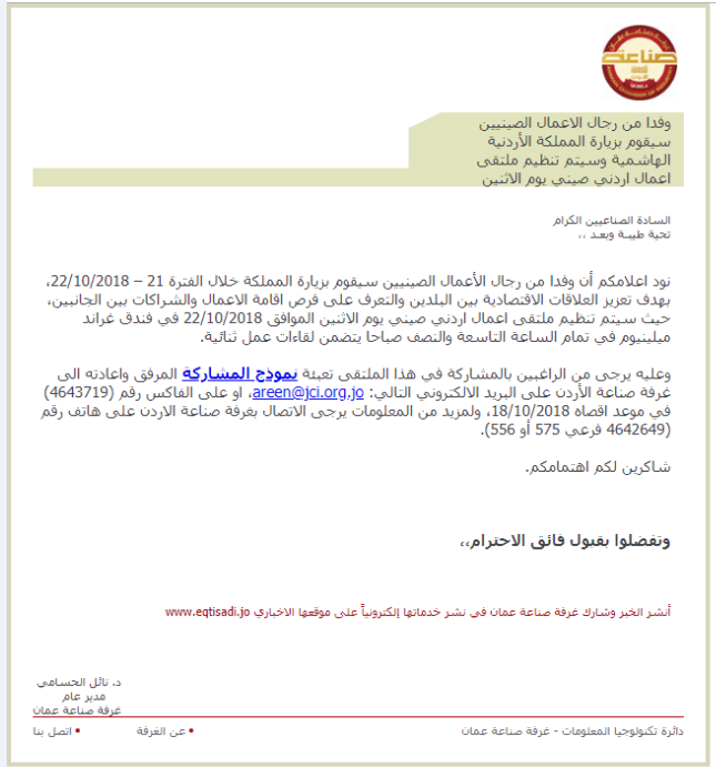 نود اعلامكم أن وفدا من رجال الأعمال الصينيين سيقوم بزيارة المملكة خلال الفترة 21 – 22/10/2018، بهدف تعزيز العلاقات الاقتصادية بين البلدين والتعرف على فرص اقامة الاعمال والشراكات بين الجانبين، حيث سيتم تنظيم ملتقى اعمال اردني صيني يوم الاثنين الموافق 22/10/2018 في فندق غراند ميلينيوم في تمام الساعة التاسعة والنصف صباحا يتضمن لقاءات عمل ثنائية.