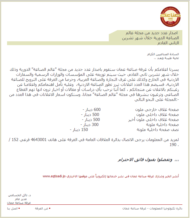 خلال شهر تشرين ثاني القادم، حيث سيتم توزيعه على المؤسسات والوزارات الرسمية والسفارات الاردنية في الخارج وكذلك على غرف التجارة والصناعة العربية، وحرصا من الغرفة على الترويج للصناعة الاردنية، فسيضم هذا العدد اعلانات تبرز تطور الصناعة الاردنية،  وعليه نأمل اهتمامكم واعلامنا عن رغبتكم بالاعلان عن منتجاتكم ، كما أننا نرحب بأي دراسات أو مقالات أو اخبار ترون انها تهم القطاع الصناعي وترغبون بنشرها في مجلة "عالم الصناعة" مجانا. وستكون اسعار الاعلانات في هذا العدد من المجلة على النحو التالي:-