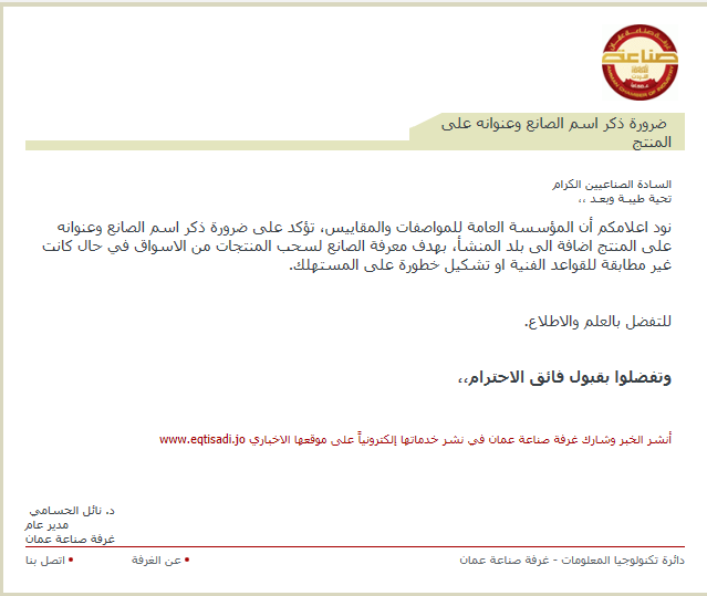 نود اعلامكم أن المؤسسة العامة للمواصفات والمقاييس، تؤكد على ضرورة ذكر اسم الصانع وعنوانه على المنتج اضافة الى بلد المنشأ، بهدف معرفة الصانع لسحب المنتجات من الاسواق في حال كانت غير مطابقة للقواعد الفنية او تشكيل خطورة على المستهلك.
