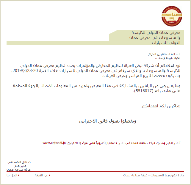 تنظيم معرض عمان الدولي للالبسة والمنسوجات، والذي سيقام في معرض عمان الدولي