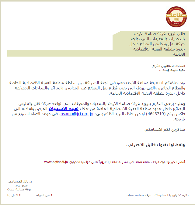 وعليه يرجى التكرم بتزويد غرفة صناعة الاردن بالتحديات والمعيقات التي تواجه