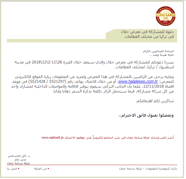 وعليه يرجى من الراغبين بالمشاركة في هذا المعرض ولمزيد من المعلومات زيارة الموقع الالكتروني للمعرض: www.halalexpo.com.tr، أو من خلال الاتصال بهاتف رقم (5521297 / 5521428) في موعد اقصاه 12/11/2018، علما بأن الجانب التركي سيقوم بتوفير الاقامة والمواصلات الداخلية لمشارك واحد من كل شركة مشاركة، فيما سيتحمل الزائر تكلفة تذكرة السفر ذهابا وايابا.