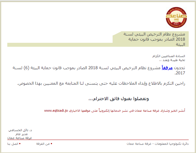 تجدون مرفقاً مشروع نظام الترخيص البيئي لسنة 2018 الصادر بموجب قانون حماية البيئة (6) لسنة 2017.
