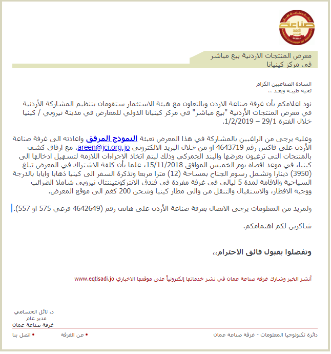 ولمزيد من المعلومات يرجى الاتصال بغرفة صناعة الأردن على هاتف رقم (4642649